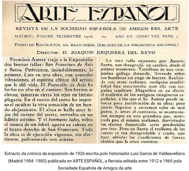 A de 1926 non era a primeira Exposición Nacional na que participaba Asorey. Á anterior, a de 1924, enviara O tesouro, unha peza executada tamén en madeira policromada que representa a unha rapaza galega que sostén en brazos un tenreiro. Unha figura cunha gran carga simbólica que incide en valores culturais esenciais de Galicia coa que gañou unha medalla de segunda clase. Á exposición de 1926 Asorey enviou dúas esculturas, Santa e San Francisco de Asís, dúas obras que, aínda que teñen moito en común, composición, proporcións, materiais e técnicas artísticas, conteñen mensaxes ben diferentes e, particularmente Santa, códigos difíciles de encaixar e asimilar entón oficialmente. De ahí que, como era de esperar, a acollida por parte do público, da crítica e do xurado fose ben diferente. A figura da Santa, unha muller espida alonxada dos ideais de beleza académicos, causou “estupor” na exposición e ocasionou un amplo debate polo seu “realismo excesivo”. Algunhas críticas da época foron implacables: “A impresión primeira é repelente” (Antonio Méndez Casal. Revista Blanco y Negro. 16/5/1926). Aínda anos máis tarde o mesmo Valle-Inclán cualificaríaa como “grotesca”. (Revista de Arte Galega. 1930). San Francisco, con todo, foi moi eloxiado e finalmente premiado.